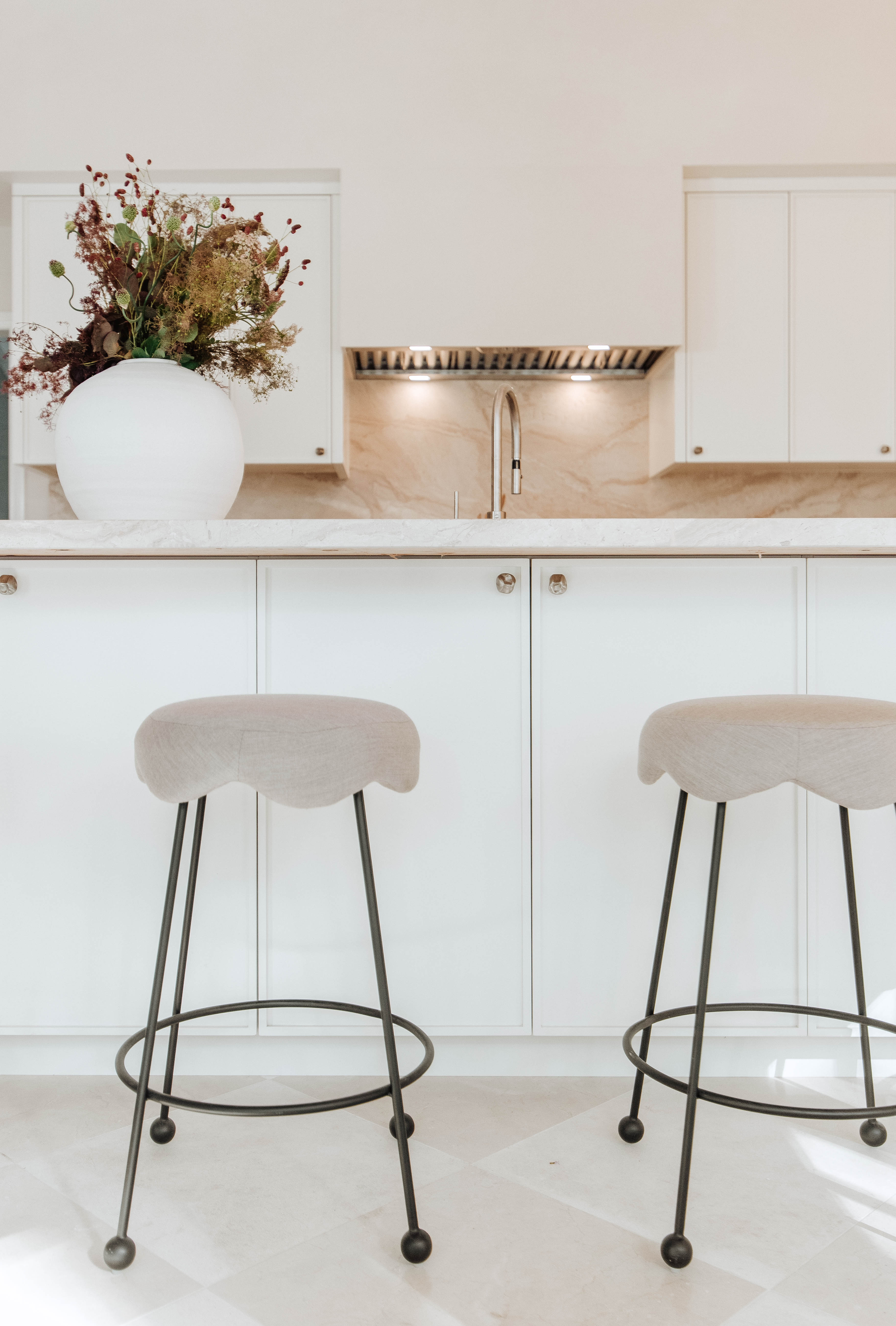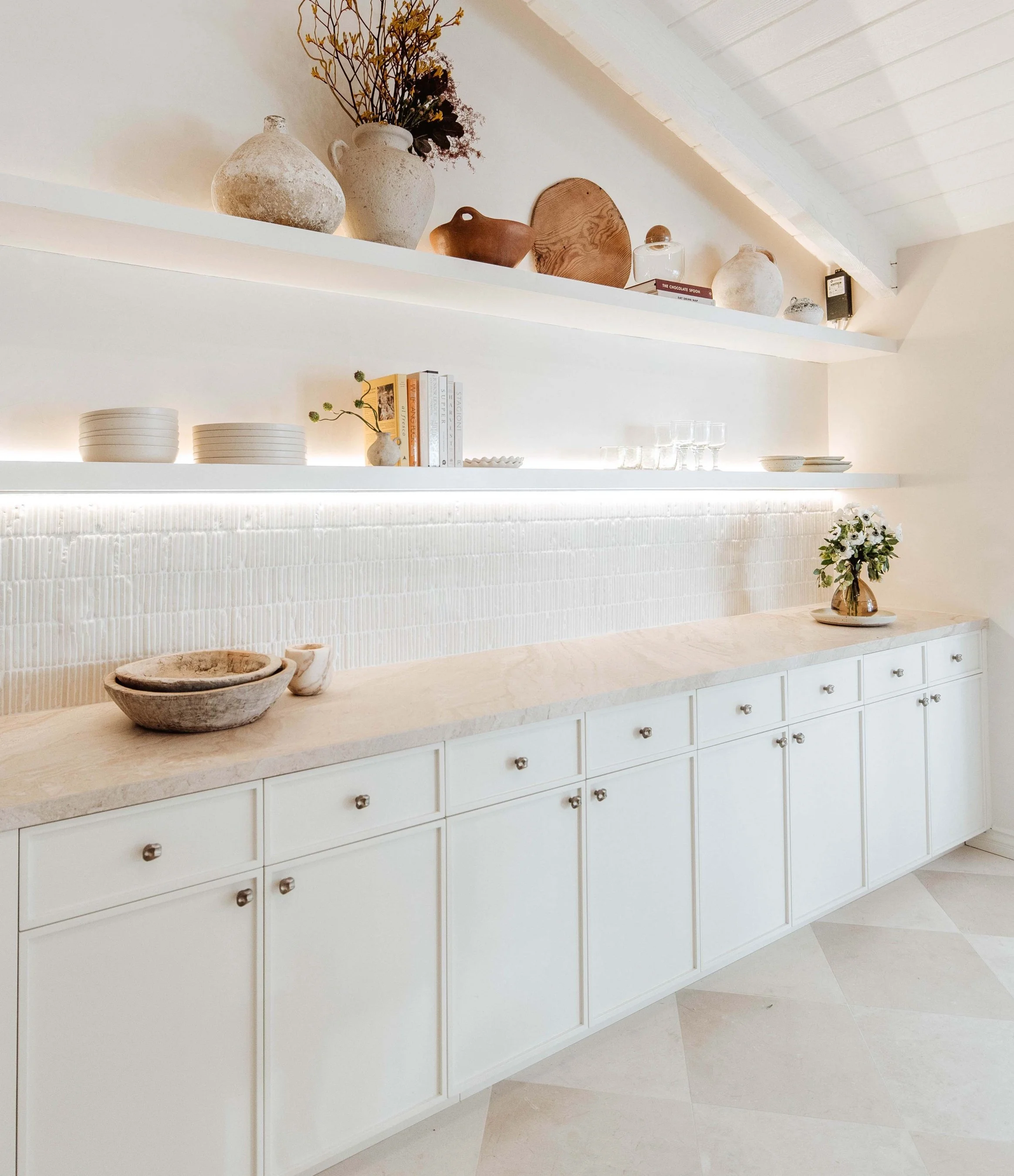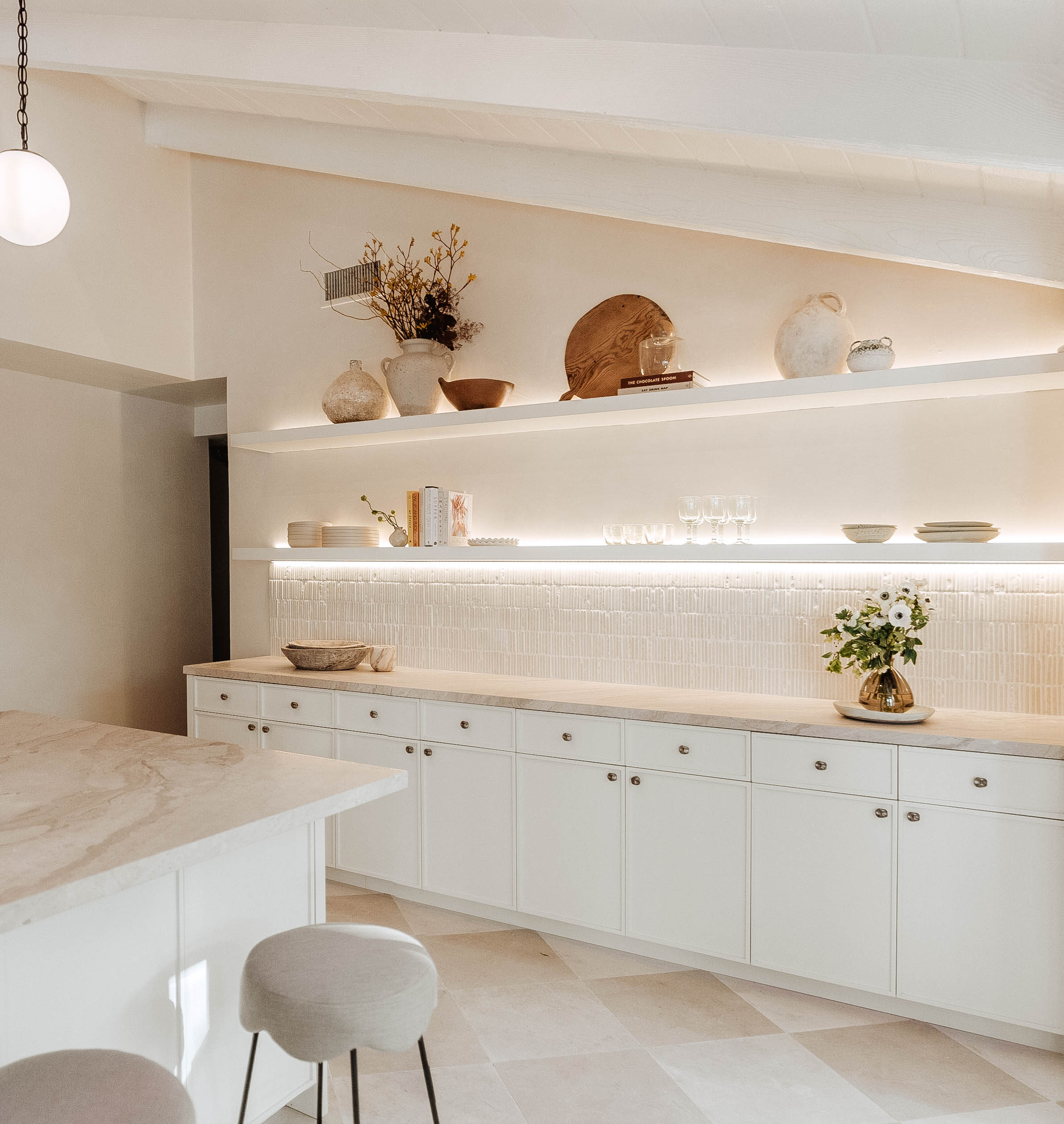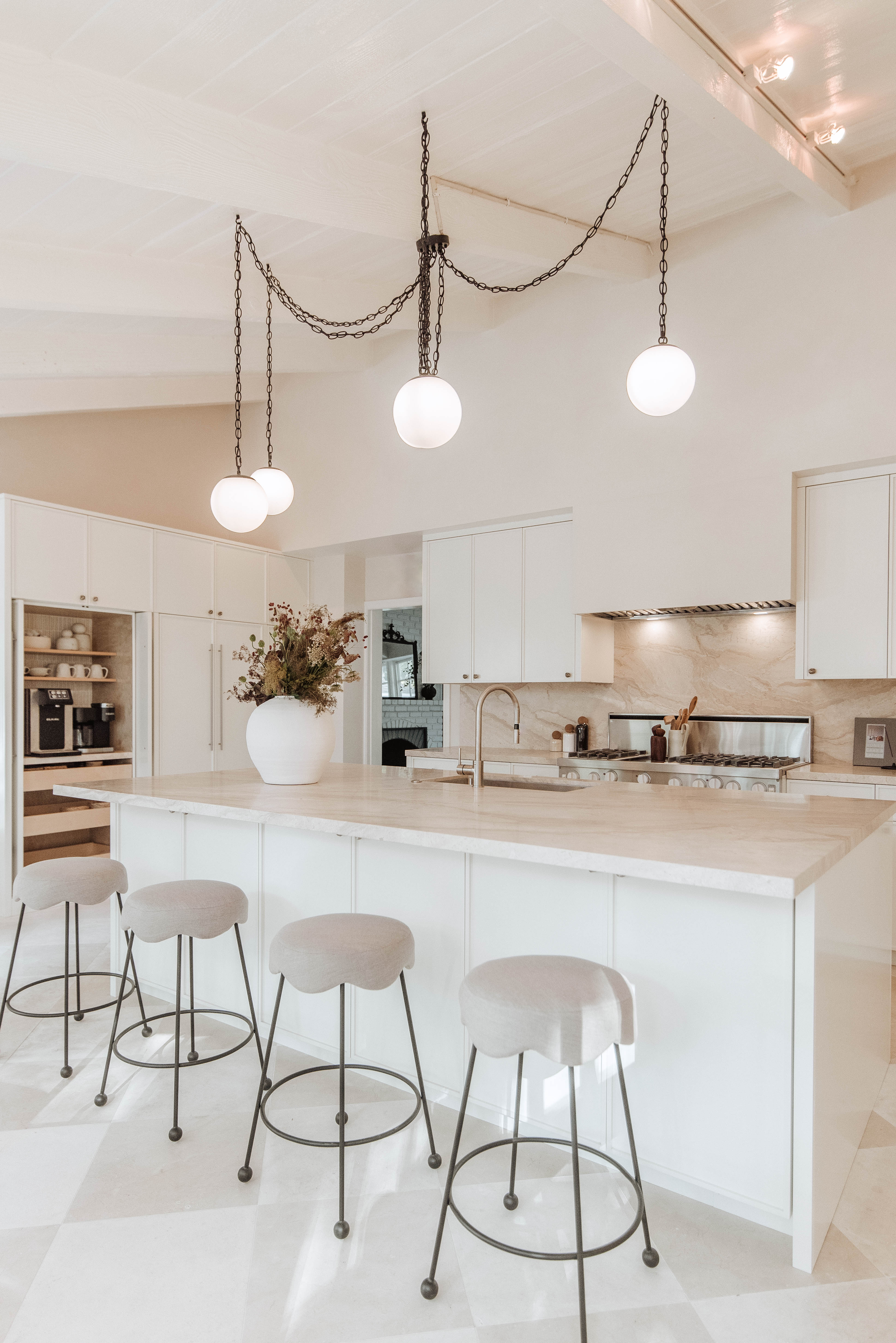A kitchen design within this ranch style home located in Hidden Hills, California — a private, equestrian community tucked away in one of the suburbs of Los Angeles. While aiming to bring the space up to date since its last renovation over ten years ago, bringing in contemporary and eclectic touches, European design influence, bright whites and deeper neutral hues, while still honoring the bones of the house itself. There is a successful meeting of tones and textures in this refreshing, comforting feeling of a true family home for gatherings, cornerstoned by the matriarch herself.